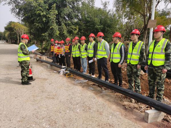 在管線施工現場,新入職的大學生黃登立根據安全文明施工標準正在檢查督促進入施工區的每一名工人。“阿姨,進入施工現場要正確佩戴好安全帽,扣好帽帶,穿好反光背心,路邊來往車輛較多,要多注意安全。”看見進入施工區的工人沒有戴好安全帽,他一個個的提醒糾正。