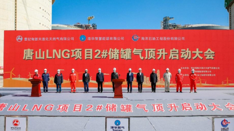曹妃甸區政府黨組成員、副區長王劍對與會嘉賓表示歡迎并對項目一線工作者致以慰問。他指出,唐山LNG項目作為國家能源發展規劃中的重要一環,對優化京津冀地區能源結構、滿足區域天然氣供需平衡要求、助力打贏“藍天保衛戰”具有深遠意義,將為河北省乃至京津冀地區帶來顯著的經濟和社會效益?!氨敬?#儲罐氣頂升是儲罐建設過程中的關鍵工序之一,是唐山LNG項目建設中的標志性事件。曹妃甸區委區政府將牢固樹立服務意識,打造優質營商環境,全力支持項目后期建設及運營,預祝項目早日建成投產?!?/p>